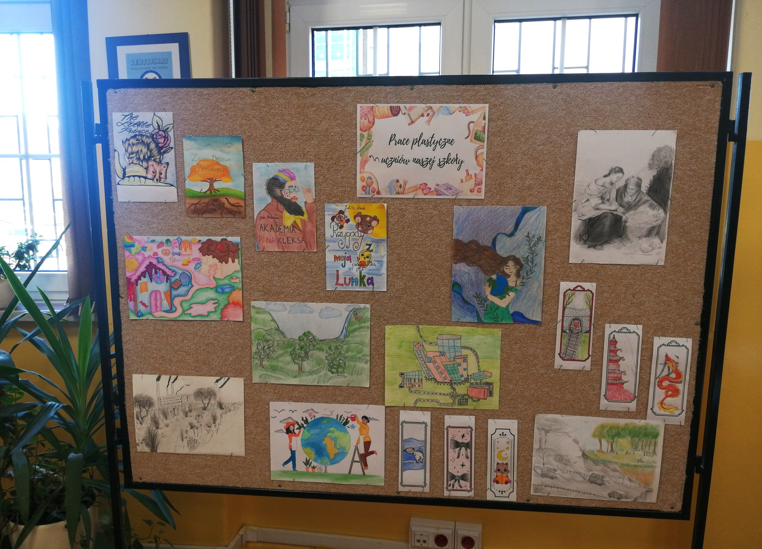 Biblioteka szkolna zaprasza do obejrzenia prac plastycznych uczniów ZST w Nysie. Prezentują one tematykę związaną z ochroną środowiska, interpretują dzieła sztuki, a także własny pomysł na okładkę i zakładkę książki.